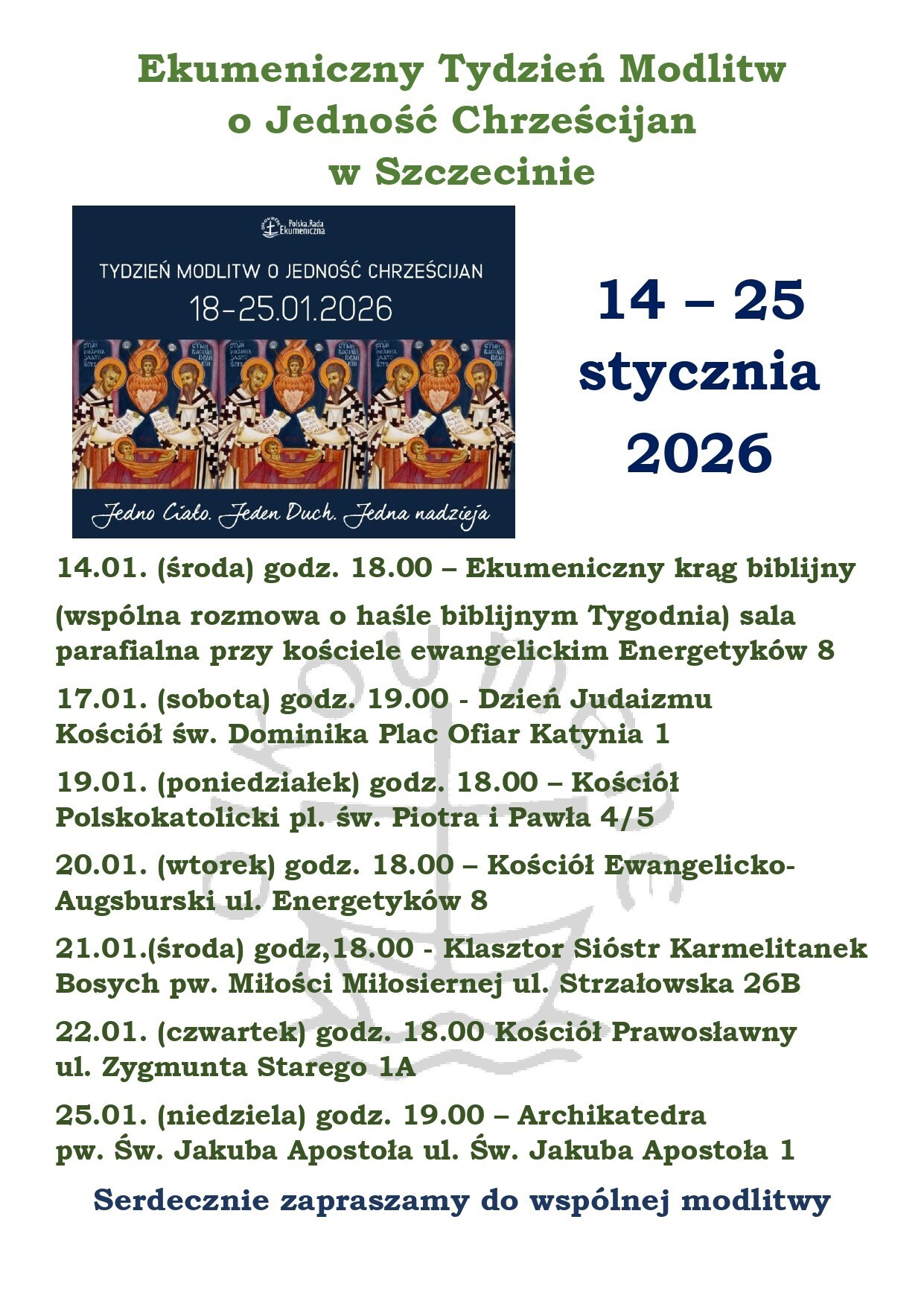Od dzisiaj trwamy w Tygodniu Modlitw o Jedność Chrześcijan do dnia 25 stycznia br. Podczas Tygodnia Modlitw rozważany będzie biblijny tekst zaczerpnięty z Listu św. Pawła do Efezjan 4, 1–13. Hasło tygodnia: Jedno Ciało. Jeden Duch. Jedna nadzieja (por. Ef 4,4).